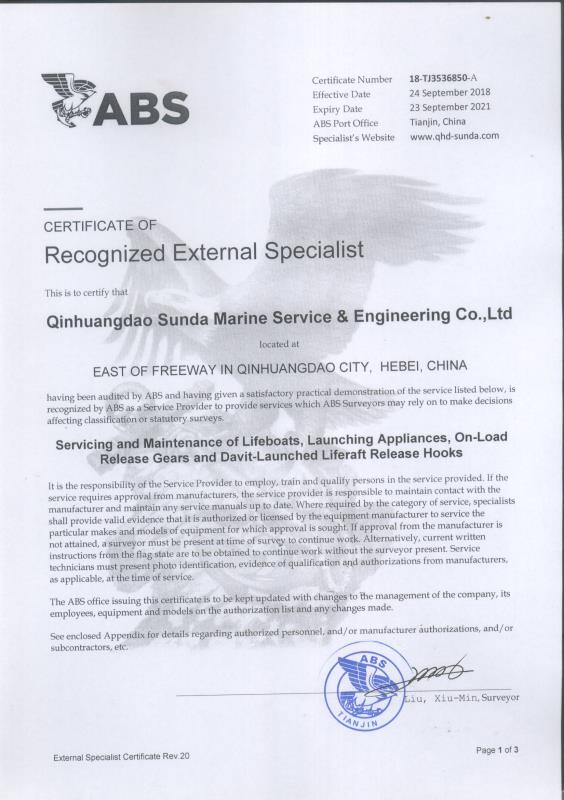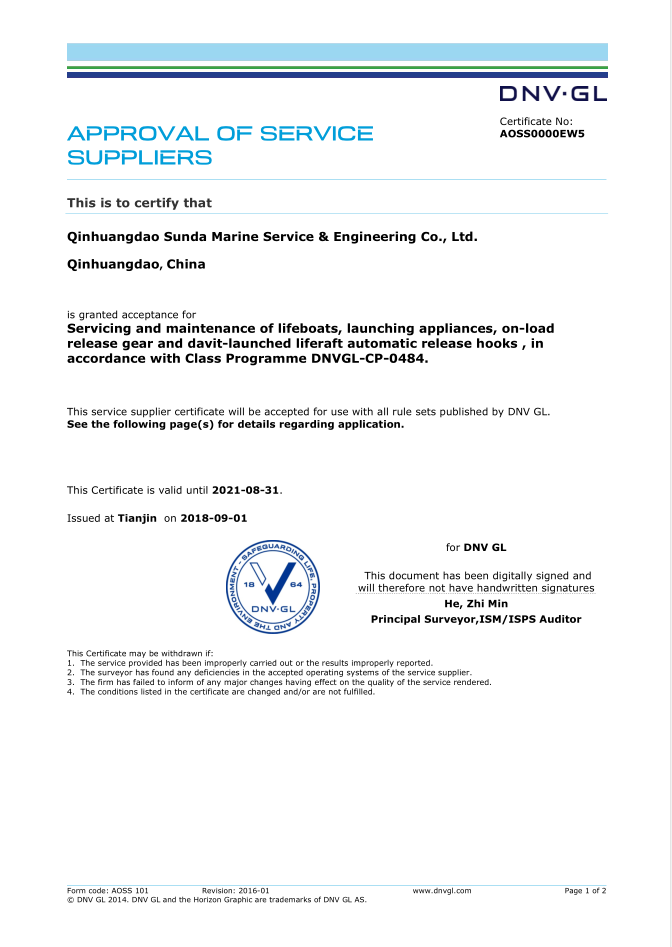 秦皇島順達船務有限公司位于美麗的海濱城市、中國北方著名的能源輸出大港--秦皇島。公司從事于船舶修理、物料供應、水下檢測、船體測厚、消防救生設備及救生艇檢驗、電氣自動化修理等服務。 公司自1997年成立至今,先后為國內(nèi)外船東修理、檢驗各類船舶萬余艘,積累了豐富的施工經(jīng)驗。公司現(xiàn)有場地100余畝,員工30余人,以及工程用車若干臺。我們公司一直本著嚴以律己、真誠待人、精益求精、信譽至上的經(jīng)營理念,以優(yōu)質(zhì)的服務、專業(yè)的施工、合理的收費,得到了國內(nèi)外船東的廣泛認可,贏得了良好的口碑和信譽。 公司已取得了中國船級社(CCS)、美國船級社(ABS)、日本船級社(NK)、德國船級社(DNV GL)等各個船級社的消防救生和救生艇檢驗資質(zhì), ...